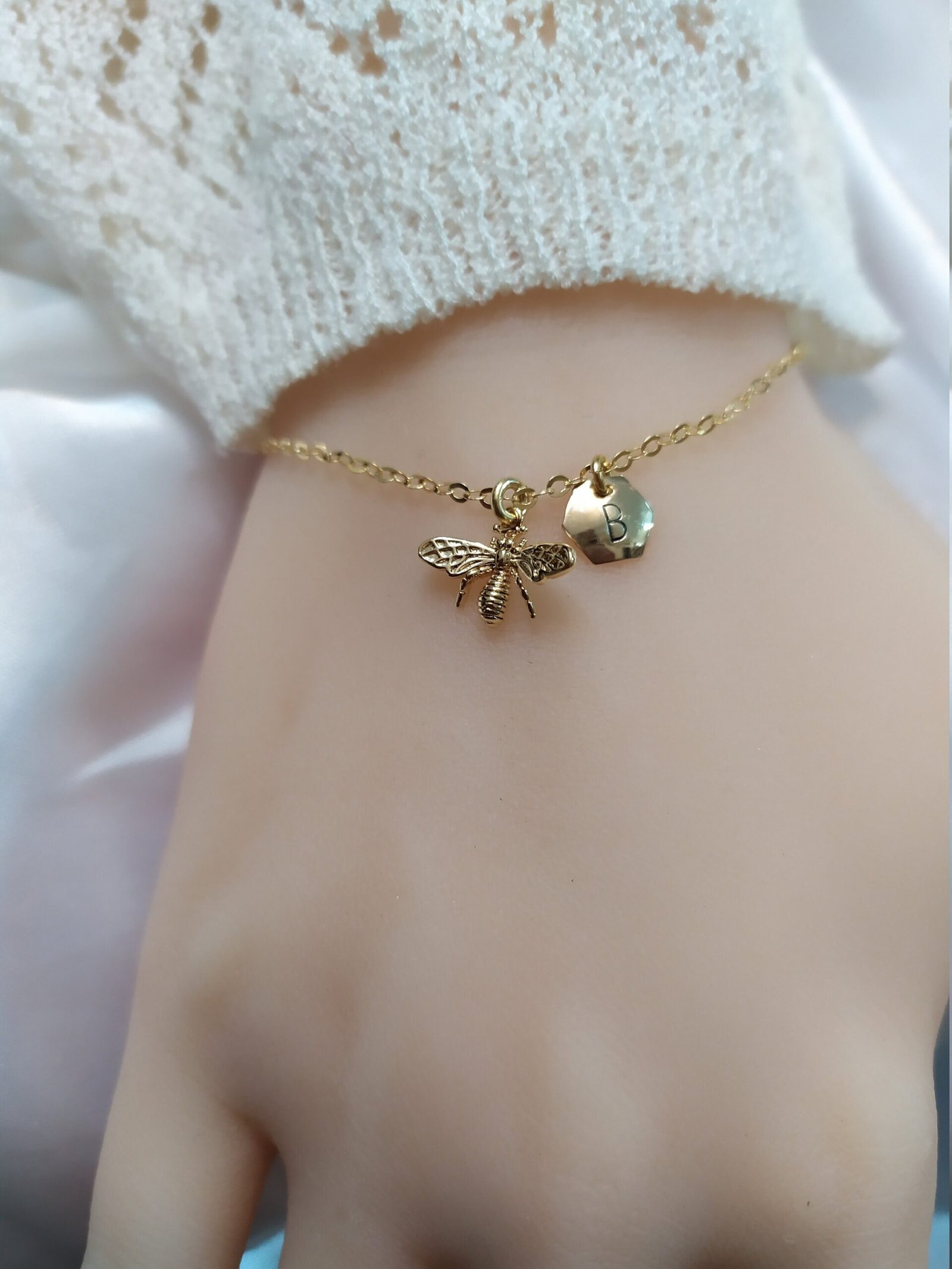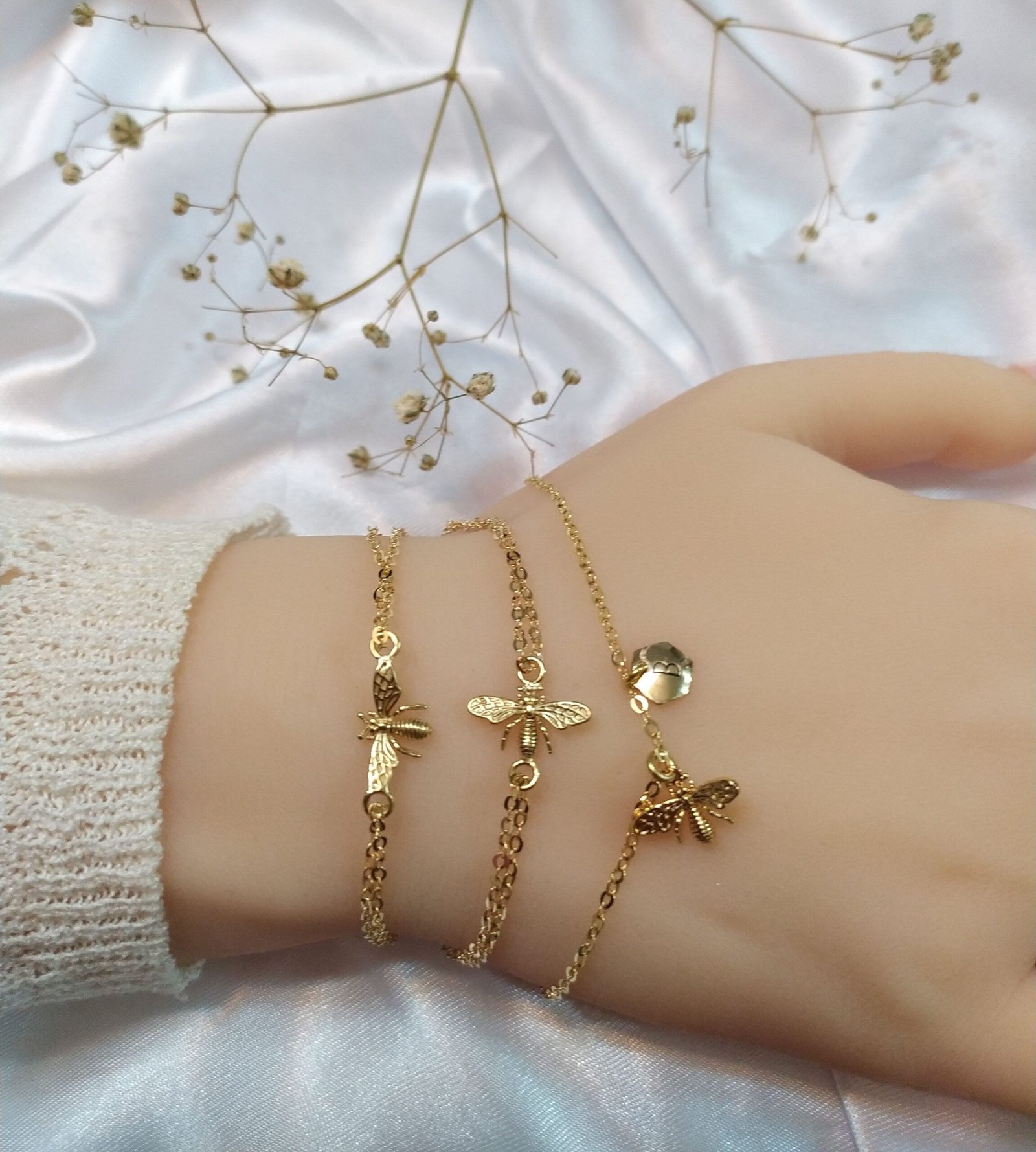 הצמיד דבורה המעופפת מחוברת עם לולאה וכשהיד בתנועה היא נעה לאורך הצמיד . כולל אות אישית בעברית או באנגלית- (הצמיד הימני בתמונה)