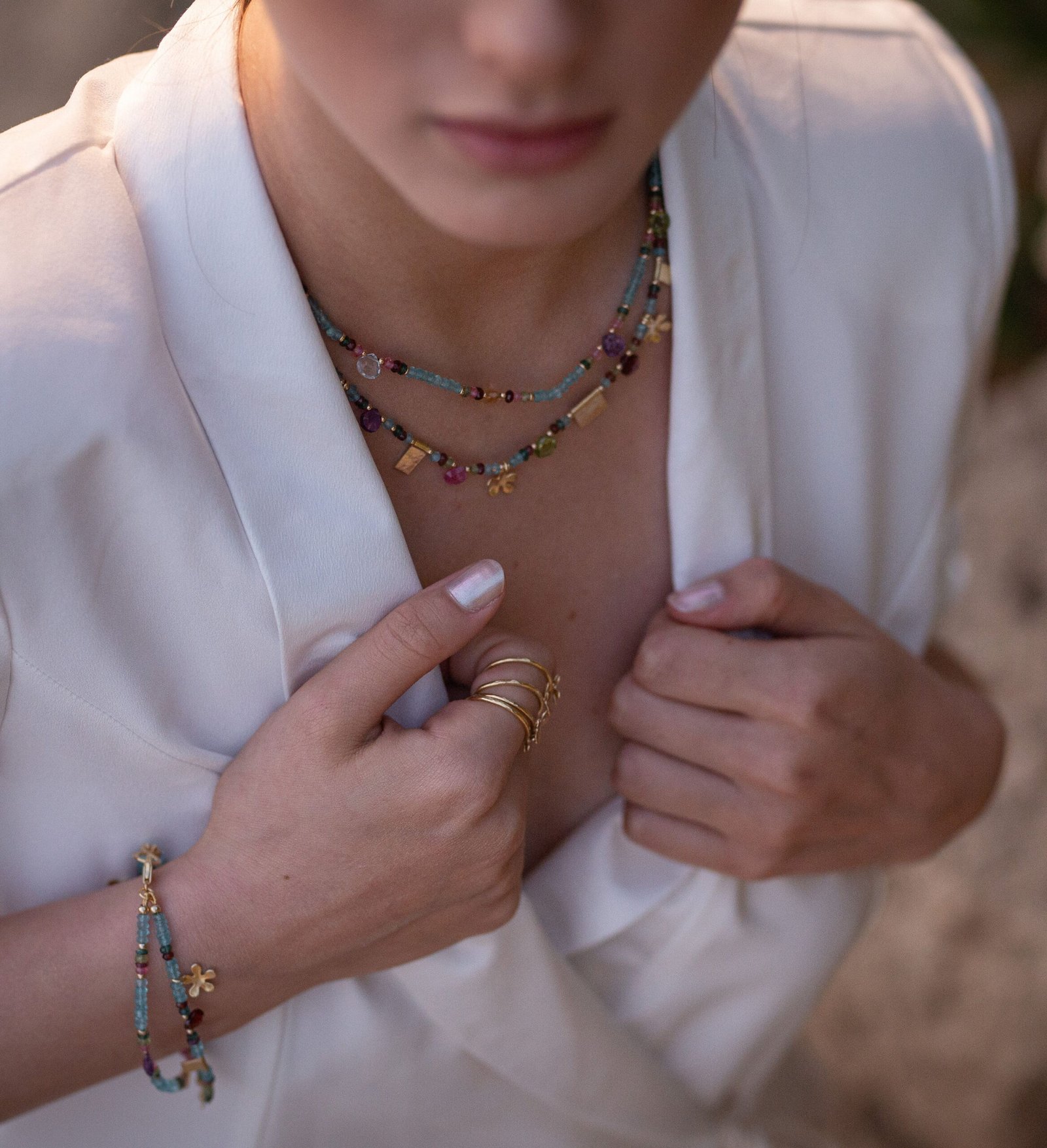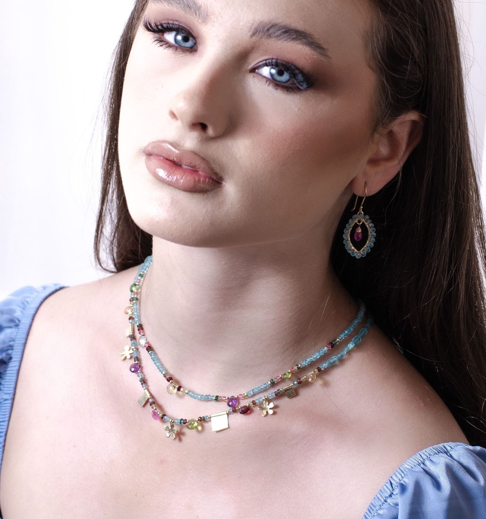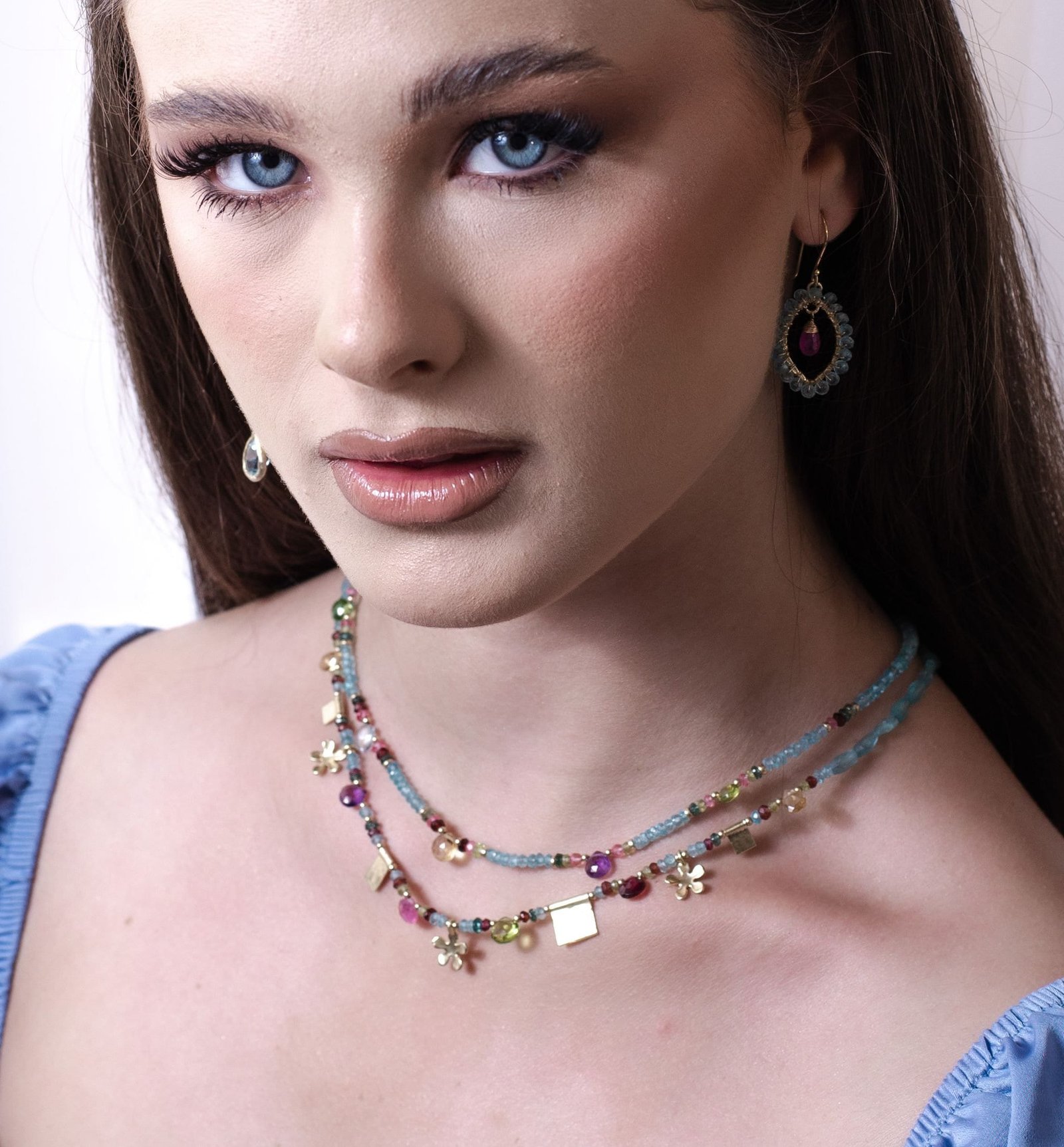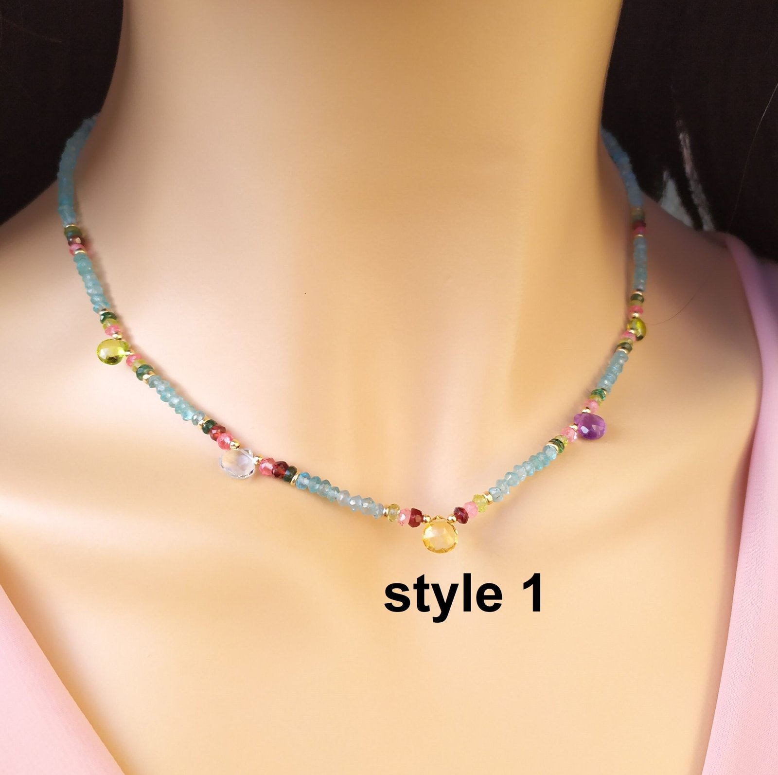 השרשרת עשויה מאבני אפטייט כחולות בשילוב ספיר ורוד, אמטיסט סיטרין, ועוד…